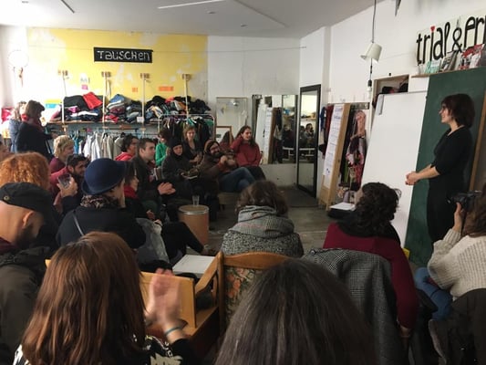 • Einen ca. 60 m² großen Raum mit zwei großen Fenstern zur Straßenseite: Momentan gibt es auf einer Seite den Tauschladen. Der kann mit weißen Vorhängen abgedeckt werden. Sowie den Zugang zum Keller und 2 große Spiegel. Auf der anderen Seite gibt es 3 ausklappbare Tische an der Wand, die können aber auch abgebaut werden. Ein großer Kühlschrank, eine mobile Bar. Der Raum ist sehr variabel und kann für alle möglichen Veranstaltungen genutzt werden.