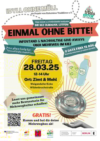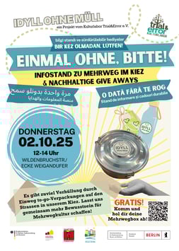 Am 28.03.2025 standen wir am Weigandufer/Ecke Wildenbruchstraße mit ganz vielen wertvollen Informationen rund ums Thema Mehrwegkultur statt Einwegkultur.