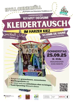 **Aktionsmonat für weniger Müll im Harzer Kiez** – Mobile Tauschbörse, Aufräumaktionen und Plogging, Sperrgutmarkt, Workshops und Mehrweg-Infoabend! Lasst uns gemeinsam die Vision eines müllfreien Harzer Kiezes schaffen und direkt zusammen anpacken!
